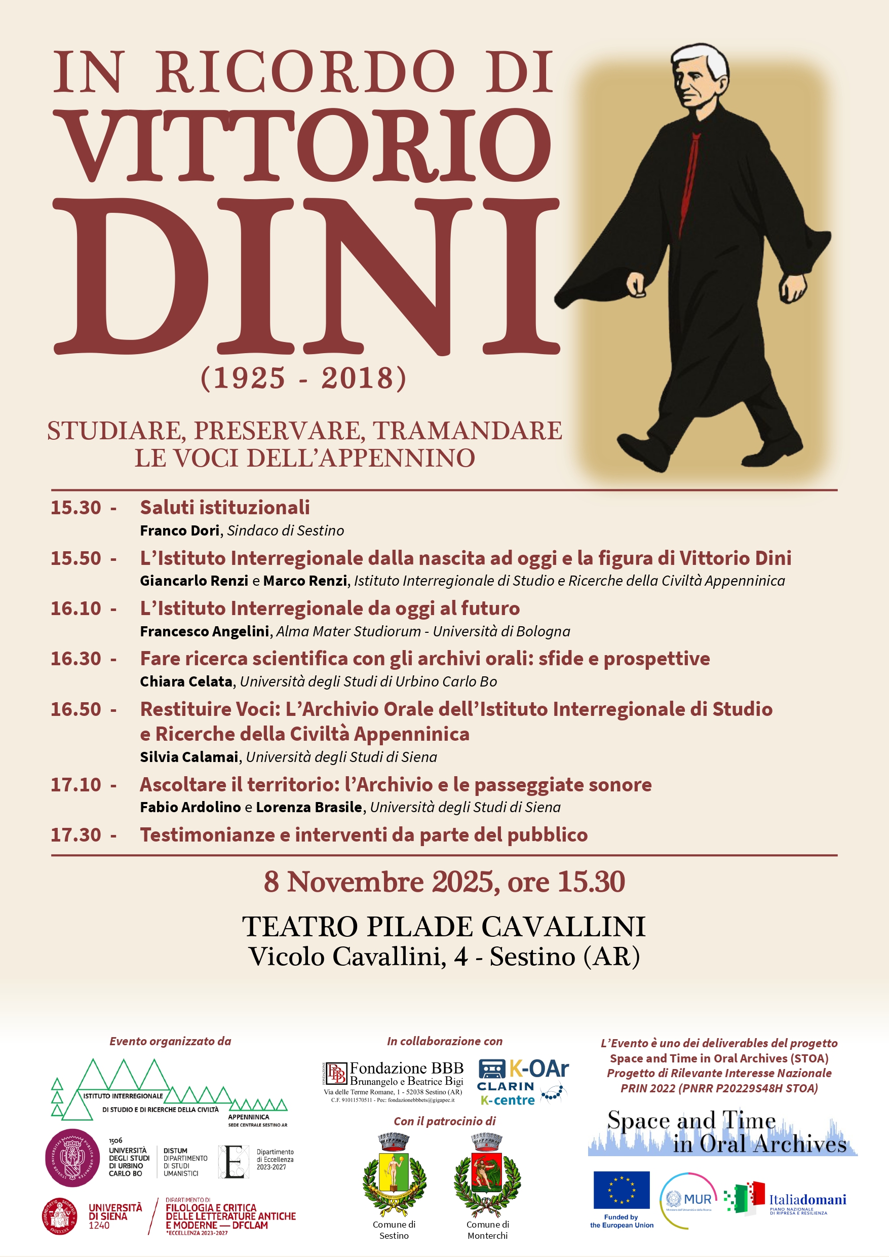 L’evento, che si svolgerà dalle ore 15.30 nel Teatro Pilade Cavallini di Sestino, è organizzato dall’Istituto interregionale di studio e ricerche della civiltà appenninica, fondato da Vittorio Dini, dall’Università di Siena e dall’Università di Urbino, con il patrocinio dei Comuni di Sestino e Monterchi e la collaborazione della Fondazione Brunangelo e Beatrice Bigi e del K-OAr – CLARIN Knowledge Centre for Oral Archives in Italy.