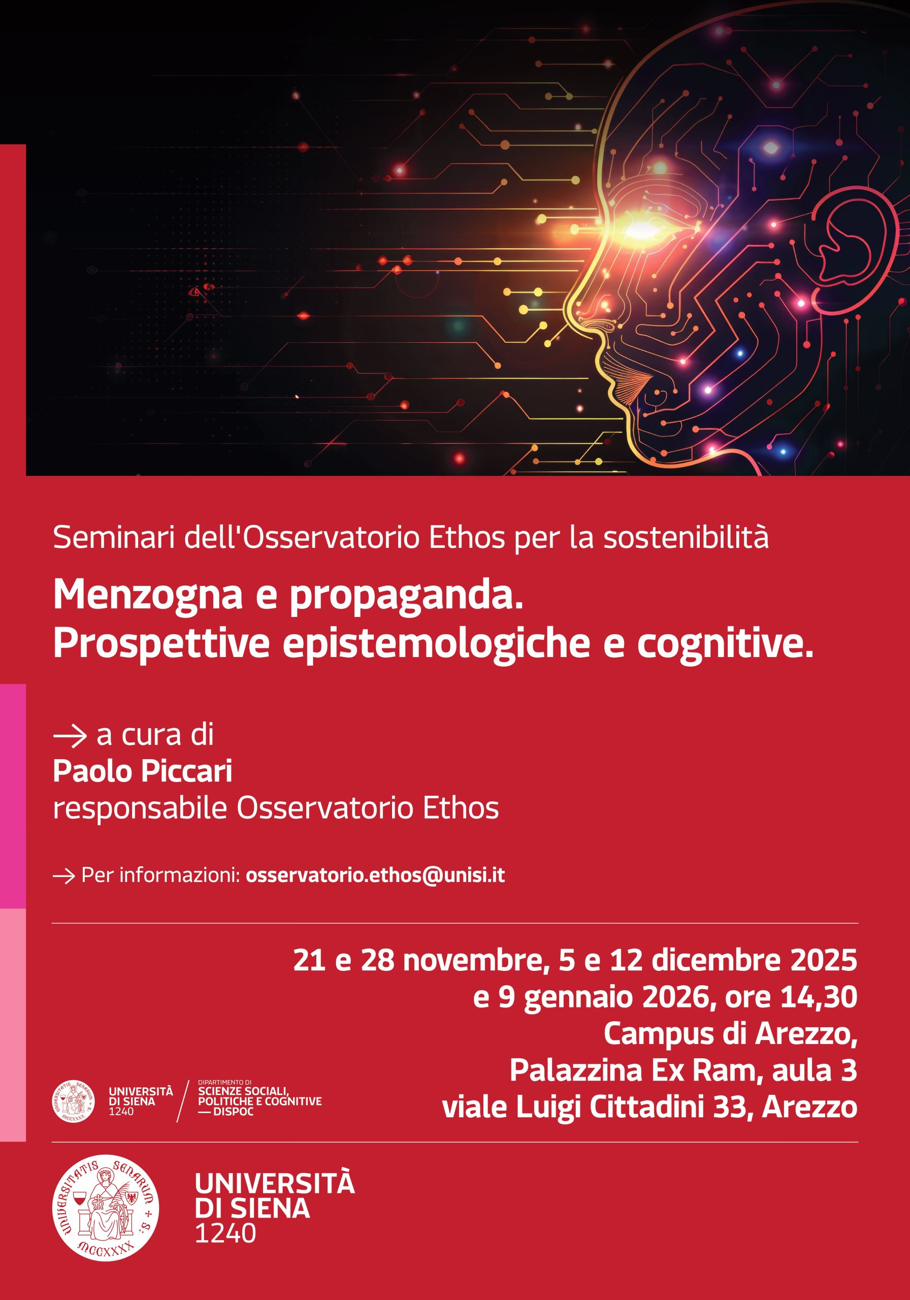 Comprendere come credenze, percezione e processi mentali possano essere orientati o manipolati è l’obiettivo del ciclo di seminari Menzogna e propaganda: prospettive epistemologiche e cognitive”, organizzato dall’Osservatorio Ethos che si svolgerà da novembre a gennaio nel Campus di Arezzo dell’Università di Siena.