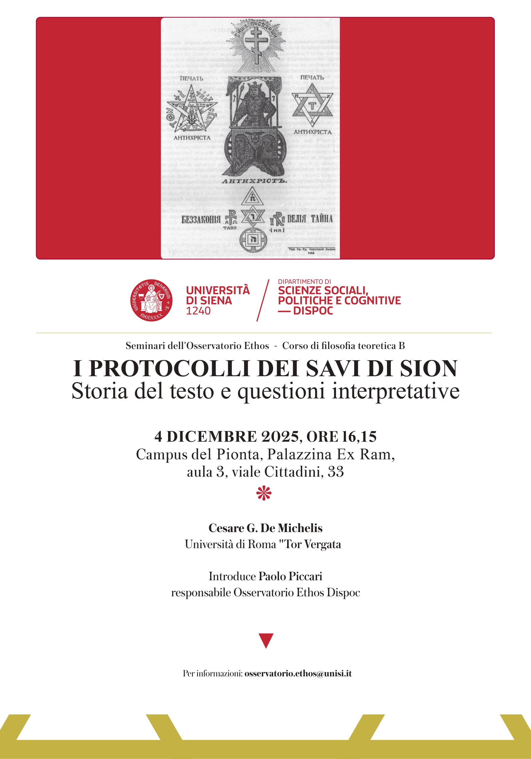 Sul grossolano falso storico redatto in Russia all’inizio del XX secolo, che continua ancora oggi a essere utilizzato come strumento della propaganda antisemita, interverrà Cesare G. De Michelis, professore emerito di Letteratura Russa all’Università di Roma Tor Vergata, che sarà introdotto dal professor Paolo Piccari, responsabile dell’Osservatorio Ethos del Dipartimento di Scienze sociali, politiche e cognitive dell’Università di Siena.