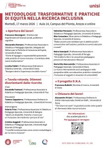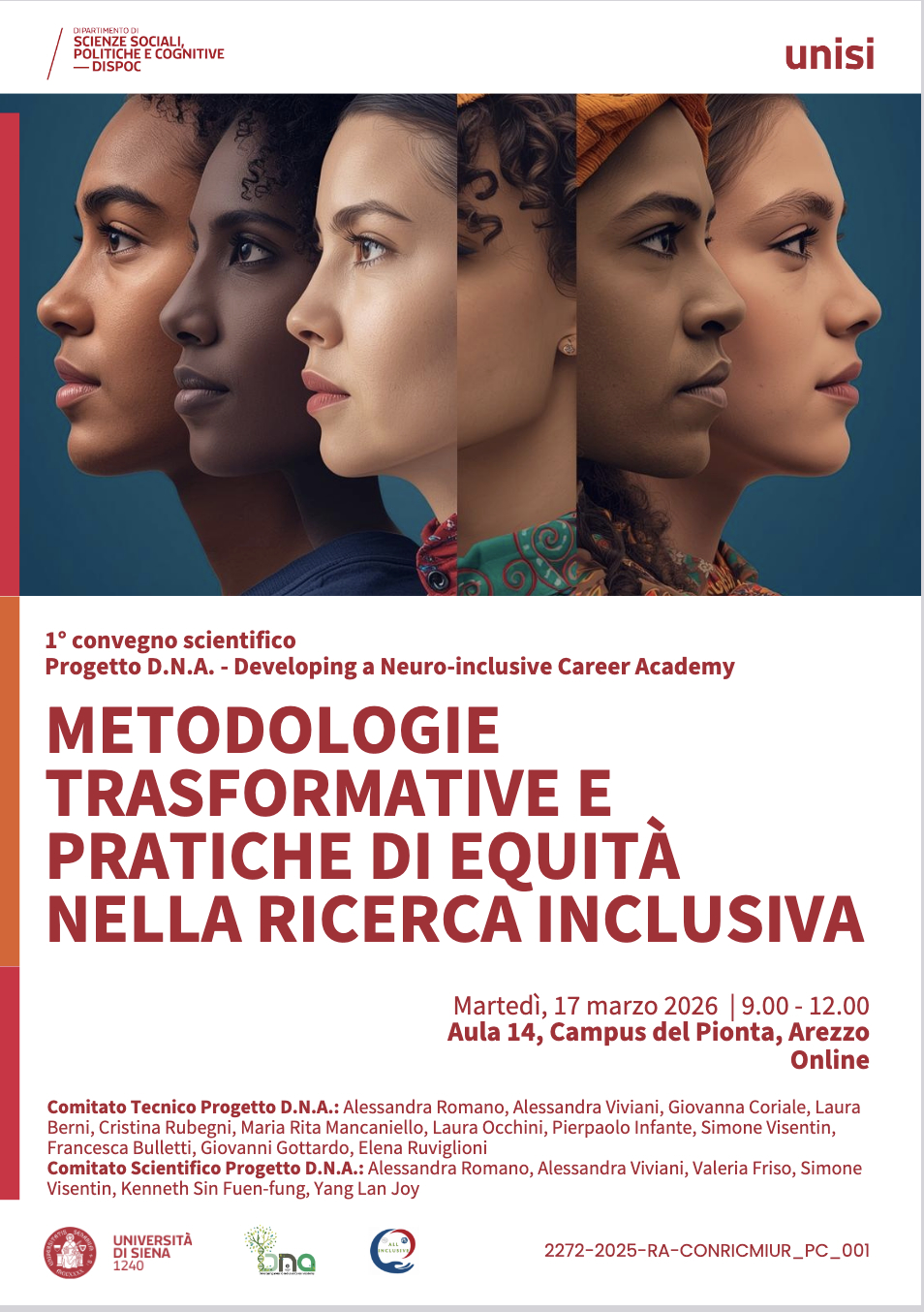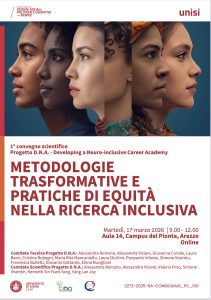 Il progetto di ricerca DNA – Developing a Neuro-inclusive Career Academy sull’adattabilità di carriera di giovani adulti con disabilità e sulla realizzazione di un’academy inclusiva per giovani con neurodiversità organizza il seminario “Metodologie trasformative e pratiche di equità nella ricerca inclusiva”, che si svolgerà il 17 marzo ad Arezzo, dalle ore 9 nell’aula 14 del Campus del Pionta (viale Cittadini).