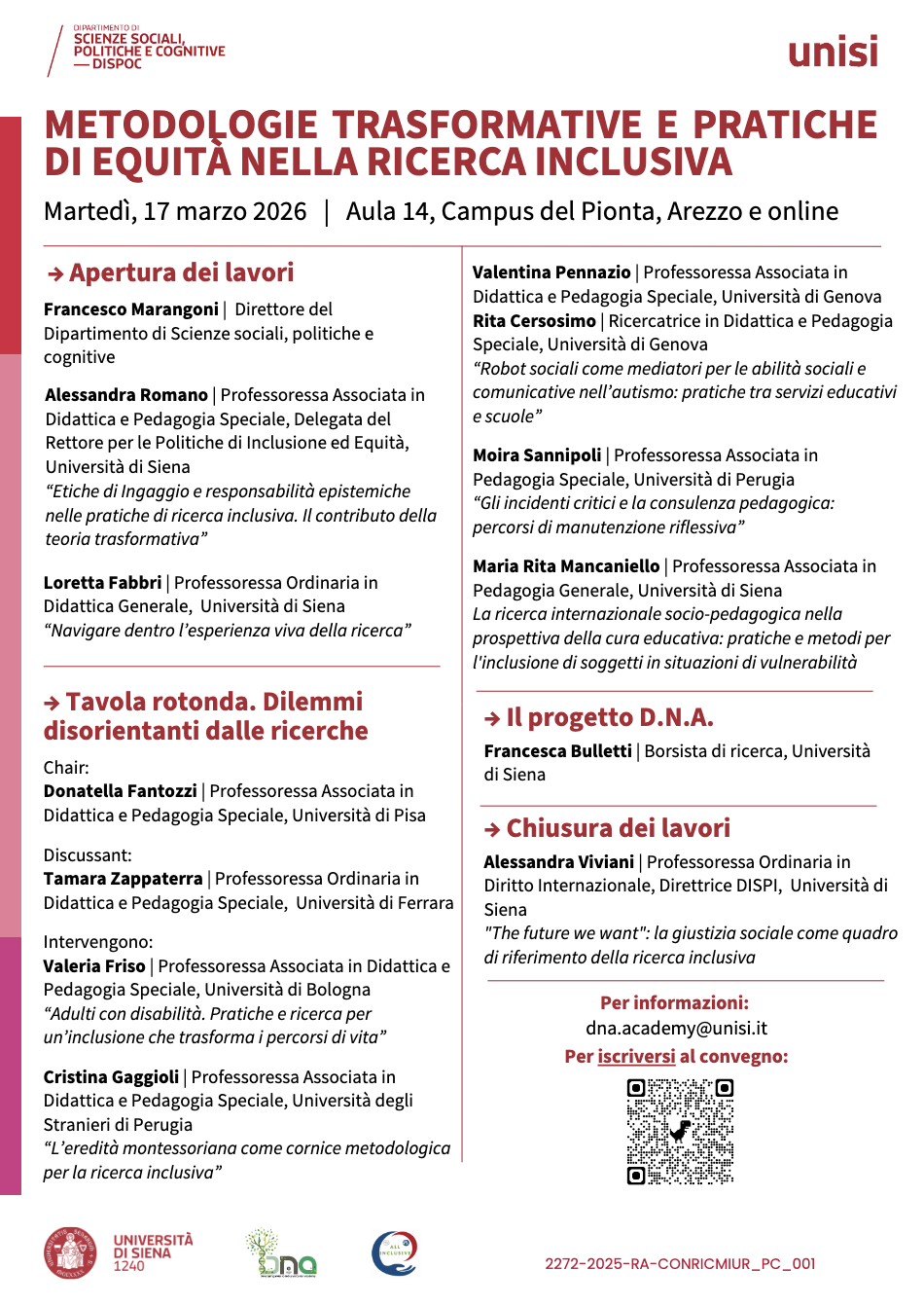 Interverranno il direttore del Dipartimento di Scienze sociali, politiche e cognitive dell’Ateneo Francesco Marangoni, la delegata del rettore alle Politiche di inclusione ed equità Alessandra Romano, la delegata del rettore al Teaching and Learning Centre Loretta Fabbri e la direttrice del Dipartimento di Scienze politiche e internazionali Alessandra Viviani. Seguirà una tavola con la partecipazione di studiose nel campo degli studi intersezionali sulle disabilità provenienti da vari atenei italiani, tra le quali Tamara Zappaterra, Donatella Fantozzi, Valentina Pennazio, Rita Cersosimo, Valeria Friso, Cristina Gaggioli e Moira Sannipoli.